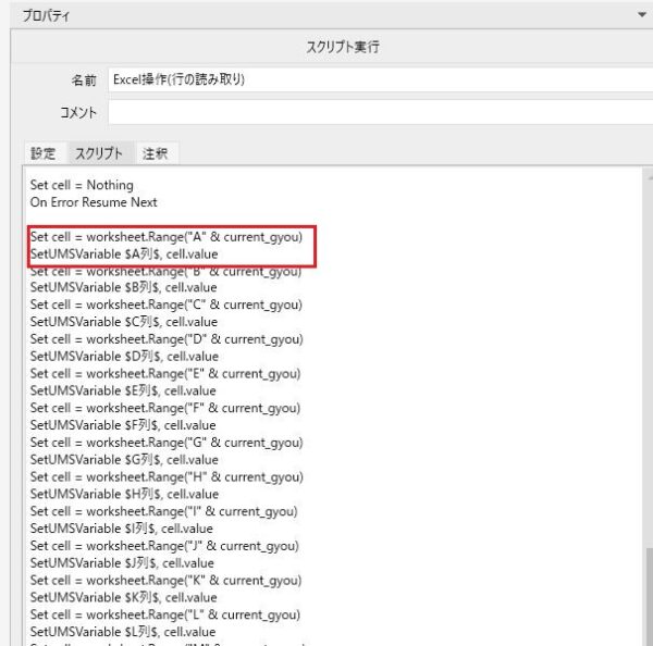 最終行の設定が完了したら、いよいよ値を読み込みです。次の『Excel操作(行の読み取り)』ライブラリを使用します。