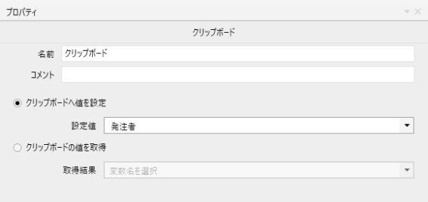 クリップボードへ値を設定・・・今回はこちらにチェックをします。設定値を入力したいデータに対応する変数に設定します。