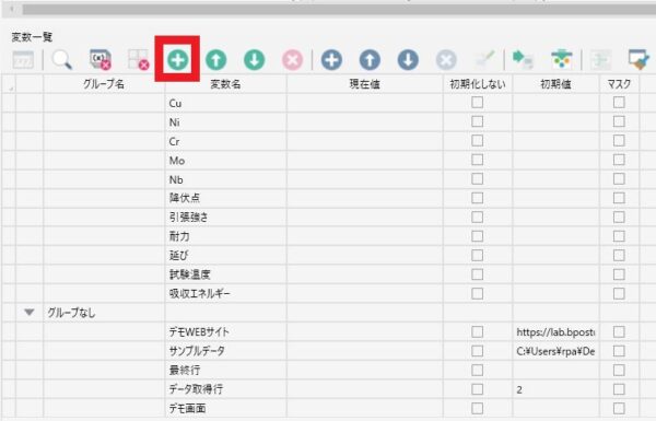 (今回はExcelデータの値に紐づく変数を作り、「サンプルデータ」にExcelブックのパスを入れ、「デモWEBサイト」にデモ画面のURLをそれぞれ初期値に入れました。)