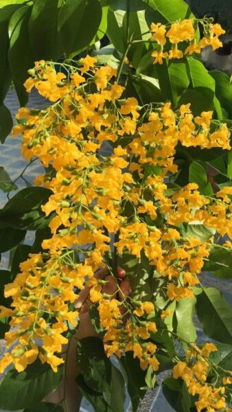 ティンジャンの黄色い特徴的な花、パダウの花を頭から見ることができます。